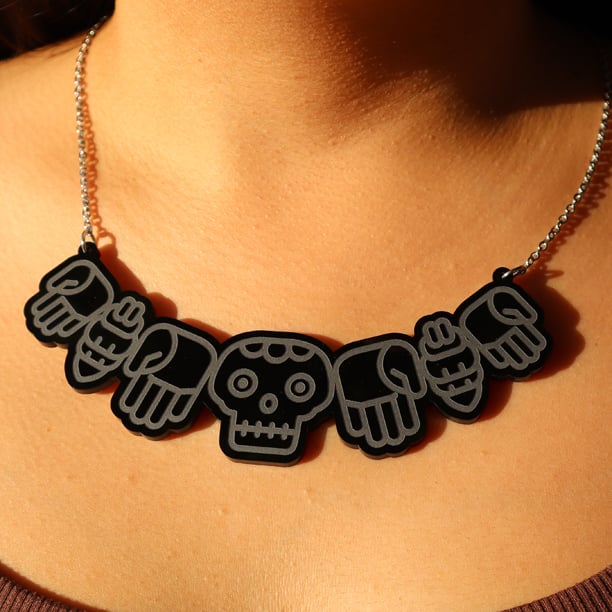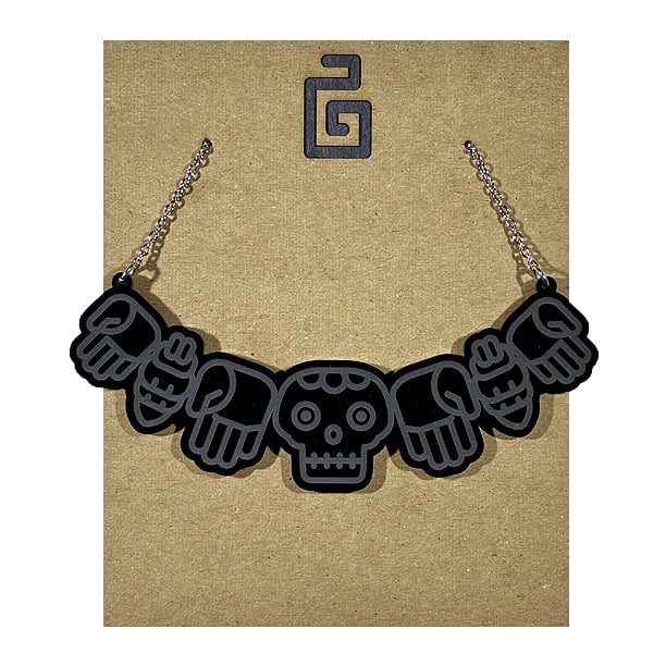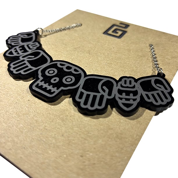 coatlicue necklace design made from 1/8" black acrylic with stainless steel chain