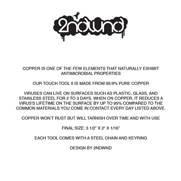 copper is one of the few elements that naturally exhibit antimicrobial properties. our touch tool II is made from 99.9% pure copper. viruses can live on surfaces such as plastic, glass, and stainless steel for 2 to 3 days. when on copper, it reduces a virus's lifetime on the surface by up to 95% compared to the common materials you come in contact every day listed above. copper won’t rust but will tarnish over time and with use