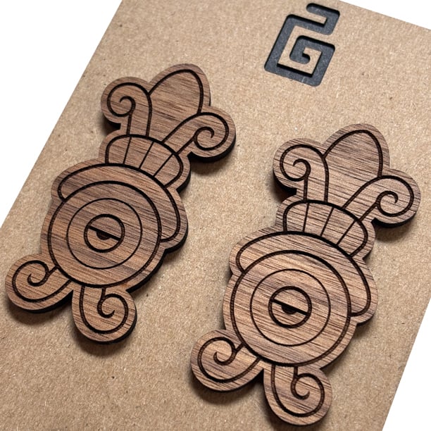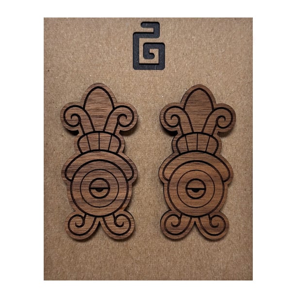 xochitl glyph stud earring design made from 1/8" walnut wood planks. xochitl is the nahuatl translation for flower. xochitl is also associated with concepts of beauty, love, and the cycle of life